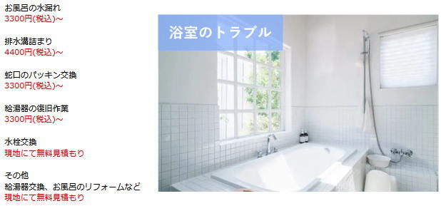 兵庫県で対応可能なお風呂(浴室)の修理サービスとなります。その他のトラブルはお気軽に受付スタッフまでご相談ください。