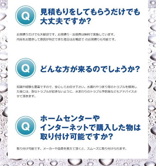 パイプから水漏れしている・シンクに水が溜まっている・パッキン交換・蛇口が固い・水が出ない・お湯が出ない・給湯器から水漏れしている・蛇口の修理・シャワーの故障・水道が止まらない・蛇口が空回りする・取ってが折れた